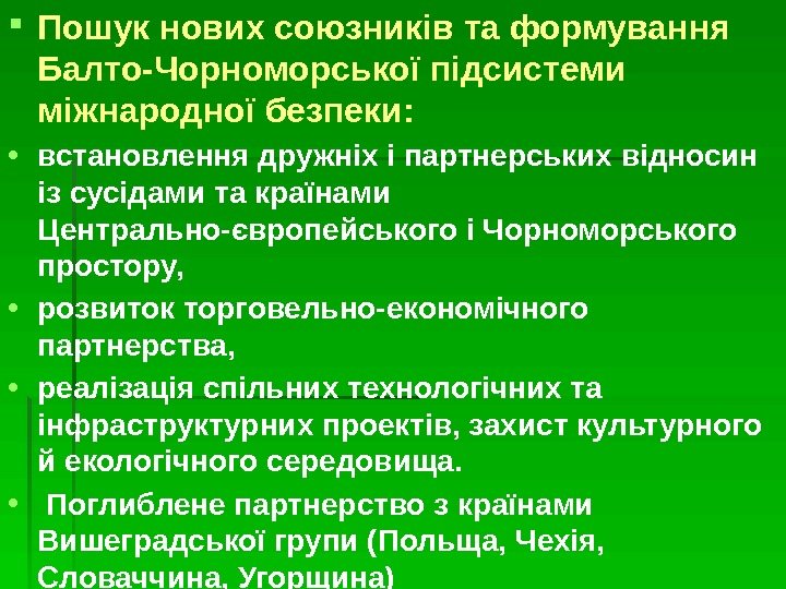 Пошук нових союзників та формування Балто-Чорноморської підсистеми міжнародної безпеки: • встановлення дружніх і партнерських відносин із сусідами та країнами Центрально-європейського і Чорноморського простору, • розвиток торговельно-економічного партнерства, • реалізація спільних технологічних та інфраструктурних проектів, захист культурного й екологічного середовища. • Поглиблене партнерство з країнами Вишеградської групи (Польща, Чехія, Словаччина, Угорщина)