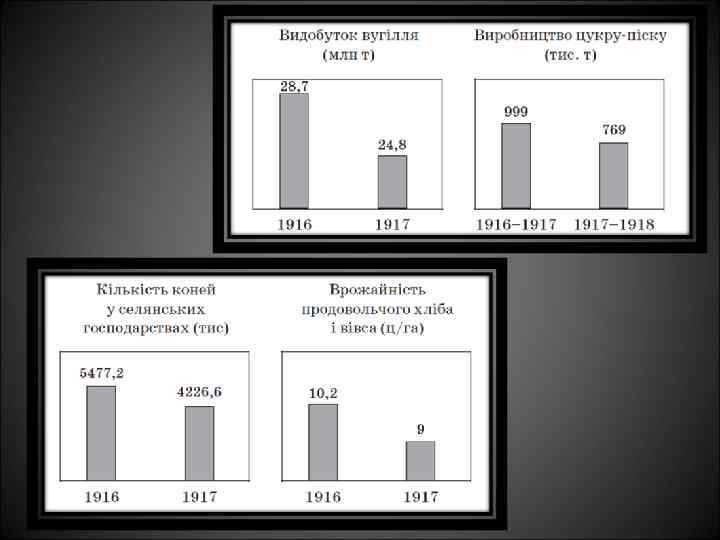 В Україні до січня 1917 р. погасло 36 доменних печей. Зменшилися посівні площі, на 200 млн пудів, порівняно з 1913 р. , знизився валовий збір зерна, почалися перебої з продовольством. Уже в перші місяці військових дій на Україні було закрито понад 400 промислових підприємств, а протягом 1915– 1917 рр. — понад 1 400. Обсяг промислового виробництва скоротився на 30– 75 %, розвалювався транспорт.