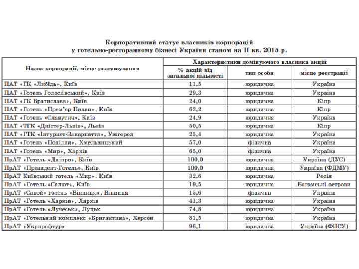 6. Має місце призупинення обігу акцій через негативний вплив зовнішнього середовища та зміну організаційно-правової форми підприємства, наприклад, у серпні 2015 р. було зупинено обіг акцій Пр. АТ «Аркадія» (готельний комплекс м. Одеси) у зв’язку із перетворенням у ТОВ. 7. На зарубіжних фондових ринках українські туристичні, готельні та ресторанні корпорації практично не представлені, що ускладнює їх доступ до ринку капіталів. У розвинутих економіках світу відбуваються протилежні процеси, що характеризуються активністю проходження процедури лістингу більшості готельних та ресторанних корпорацій. 8. Кризові явища блокують процес входження на український ринок міжнародних мереж. 9. Прослідковується зародження процесів формування національних мереж, особливо на ринку ресторанного бізнесу (холдинг «Фест!» , « 23 ресторани» , «Козирна карта» , «Мировая карта» , «Швидко» , «Пузата хата» та інші). Щодо готельного бізнесу, то в Україні існує лише три національних готельних оператори: Premiere-Hotels International (7 готелів), Reikartz Hotels&Resorts (14 готелів) та Royal Hospitality Group.