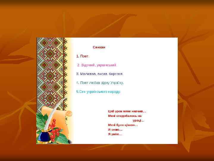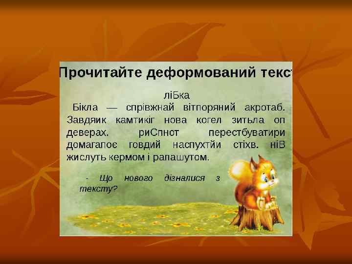 9. Вправа”Корректор” Умовні позначки [-] – Зайве, непотрібне – закреслити √ - пропуск – зроби вставку, доповни. < - розгорни думку, напиши детальніше. 1 2 3 - невдалий порядок слів – заміни його ~~~~~ - невипрадане повторення, невдалі слова – заміни, надпиши інші. _ _ _ - порушена послідовність речень; встанови правильний порядок Наприклад : Весняний вітер 3 1 Клен цілу зиму спав. Крізь сон Клен хуртовини чув ~~~~~ 2 завивання. Холодний вітер √ віти Клена. Прокинувся ~~~~~ --- --- --Клен. Та ось одного сонячного ранку відчув Клен, ніби до --- --нього доторкнулося щось тепле і лагідне. Вимокли кущі та дерева. А то прилинув теплий весняний вітер.