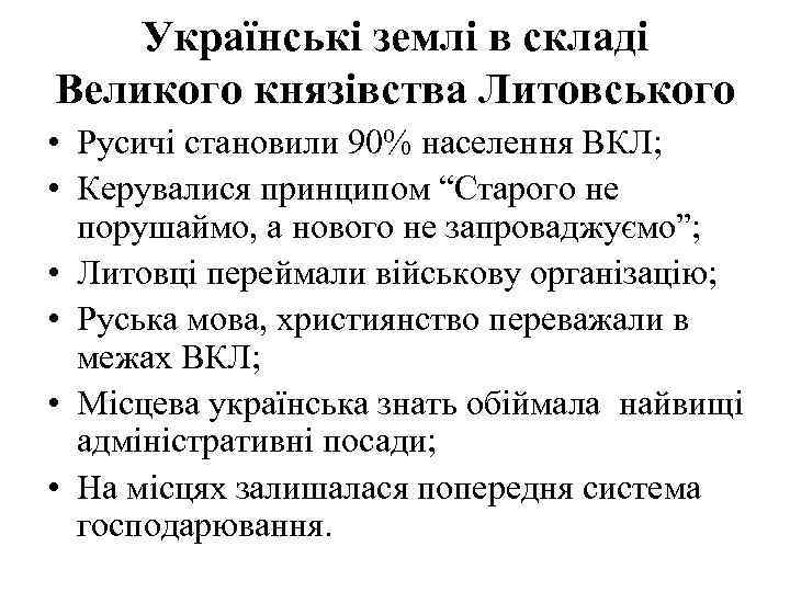 Українські землі в складі Великого князівства Литовського • Русичі становили 90% населення ВКЛ; • Керувалися принципом “Старого не порушаймо, а нового не запроваджуємо”; • Литовці переймали військову організацію; • Руська мова, християнство переважали в межах ВКЛ; • Місцева українська знать обіймала найвищі адміністративні посади; • На місцях залишалася попередня система господарювання.