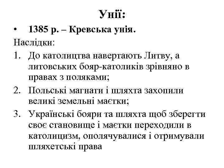 Унії: • 1385 р. – Кревська унія. Наслідки: 1. До католицтва навертають Литву, а литовських бояр-католиків зрівняно в правах з поляками; 2. Польські магнати і шляхта захопили великі земельні маєтки; 3. Українські бояри та шляхта щоб зберегти своє становище і маєтки переходили в католицизм, ополячувалися і отримували шляхетські права