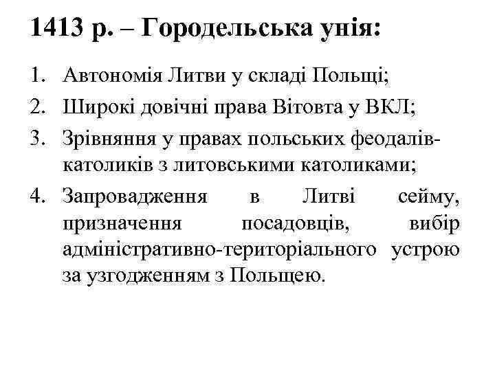 1413 р. – Городельська унія: 1. Автономія Литви у складі Польщі; 2. Широкі довічні права Вітовта у ВКЛ; 3. Зрівняння у правах польських феодалів- католиків з литовськими католиками; 4. Запровадження в Литві сейму, призначення посадовців, вибір адміністративно-територіального устрою за узгодженням з Польщею.