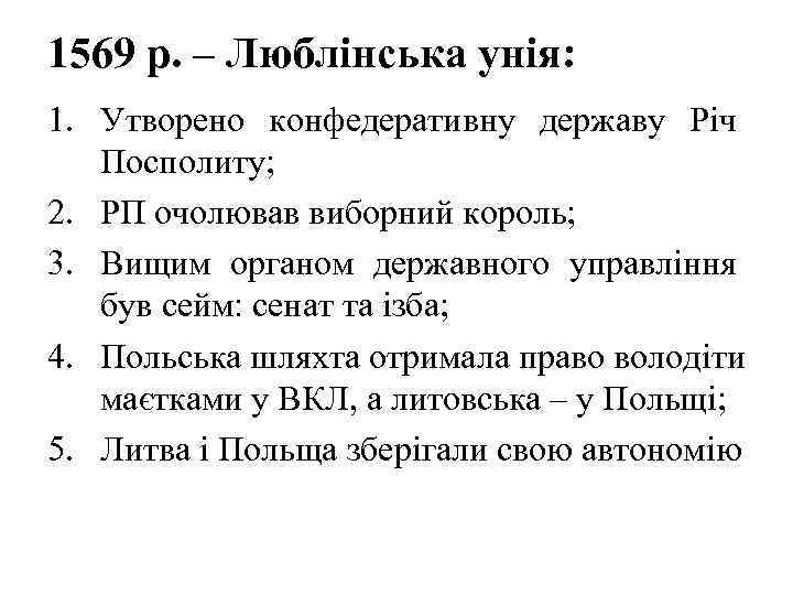 1569 р. – Люблінська унія: 1. Утворено конфедеративну державу Річ Посполиту; 2. РП очолював виборний король; 3. Вищим органом державного управління був сейм: сенат та ізба; 4. Польська шляхта отримала право володіти маєтками у ВКЛ, а литовська – у Польщі; 5. Литва і Польща зберігали свою автономію