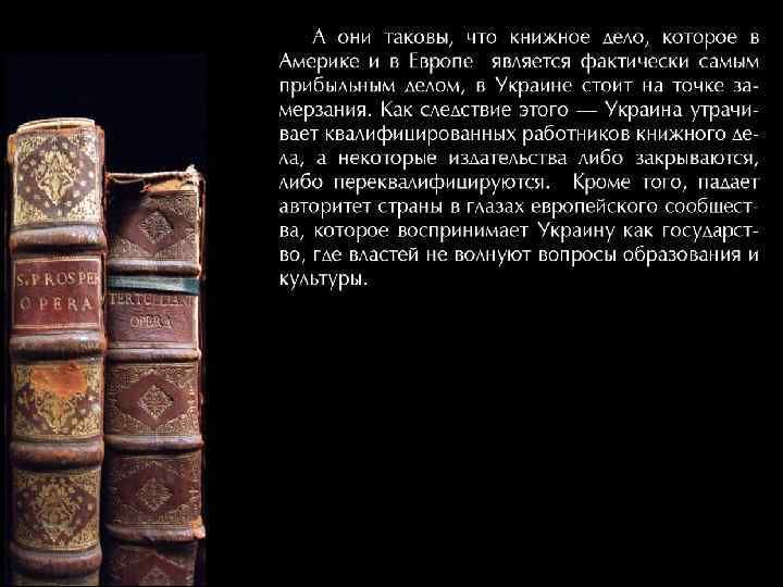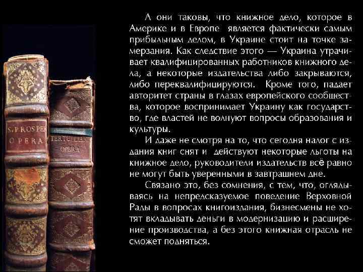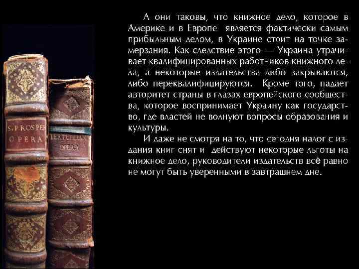 В культуре различных стран мира книга всегда занимала особое место. Никогда книгу не ставили в один ряд с обычными товарами, такими как мебель, посуда или продукты питания. Книга всегда считалась духовной ценностью, которая утверждает разум человека, сопровождает его на протяжении всей жизни. Так было и так есть. Но только не в Украине. … Учитывая темпы кризиса книгоиздания в нашей стране, украинская книга скоро станет необычайной редкостью и вряд ли кто-либо из числа беспристрастных людей осмелится опровергать это утверждение. На сегодняшний день в Украине издается книжек в 3 -4 раза меньше, чем в странах ближнего зарубежья и в 15 -20 раз меньше, чем в Западной Европе. Например, в 2002 году в Украине было издано 8 млн. экземпляров книг (не считая учебников), в то время как в России в том же году было издано около 35 млн. , а в Польше - более 150 млн!