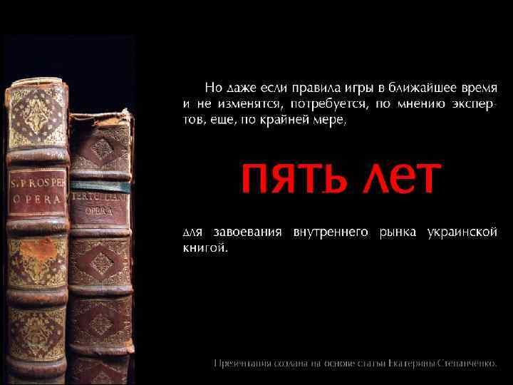 Таким образом более дешевая русская книга полностью захватила наш книжный рынок. И вследствие этого, ежегодно из Украины уплывает около 100 млн. долларов. То есть мы инвестируем иностранного производителя, на всех стадиях производства: от изготовления бумаги и необходимых для этого компонентов, до печатания книги. И вполне понятно, что, учитывая неравные условия конкуренции, украинская книга остается на дне. Зато в России, благодаря разумному законодательству, книгоиздательство занимает третье место по пополнению государственной казны (1 -е и 2 -е места занимают нефть и газ).