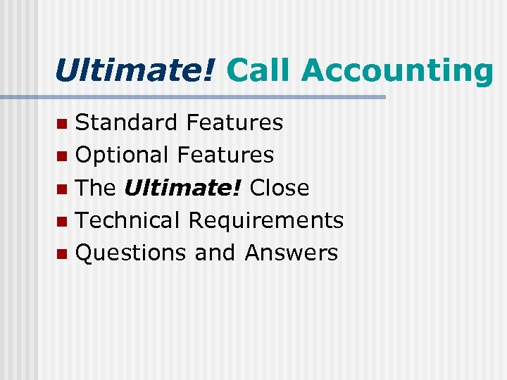 Ultimate! Call Accounting Standard Features n Optional Features n The Ultimate! Close n Technical Requirements n Questions and Answers n