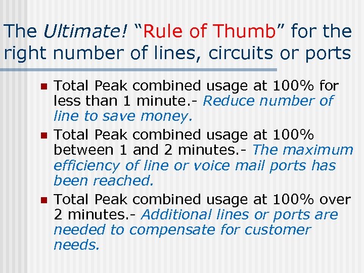 The Ultimate! “Rule of Thumb” for the right number of lines, circuits or ports n n n Total Peak combined usage at 100% for less than 1 minute. - Reduce number of line to save money. Total Peak combined usage at 100% between 1 and 2 minutes. - The maximum efficiency of line or voice mail ports has been reached. Total Peak combined usage at 100% over 2 minutes. - Additional lines or ports are needed to compensate for customer needs.