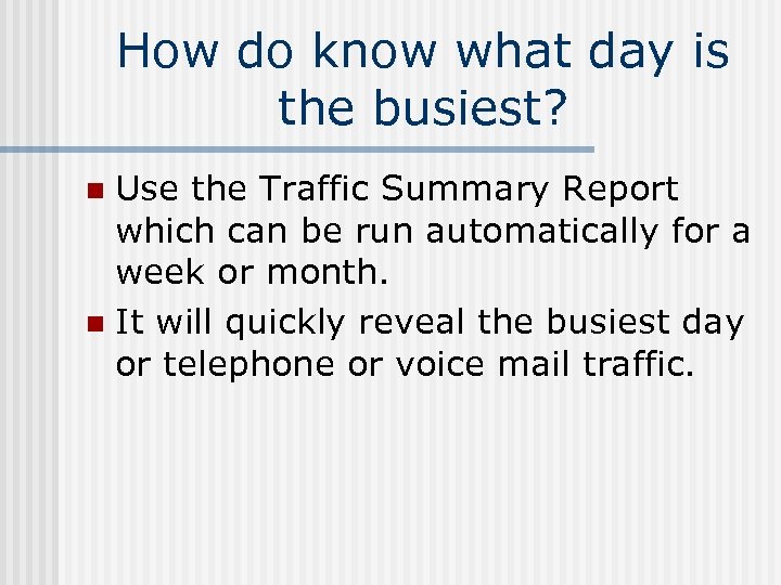 How do know what day is the busiest? Use the Traffic Summary Report which can be run automatically for a week or month. n It will quickly reveal the busiest day or telephone or voice mail traffic. n