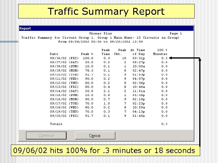 Traffic Summary Report 09/06/02 hits 100% for. 3 minutes or 18 seconds