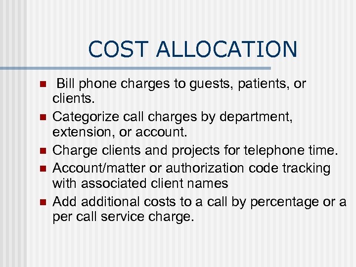 COST ALLOCATION n n n Bill phone charges to guests, patients, or clients. Categorize call charges by department, extension, or account. Charge clients and projects for telephone time. Account/matter or authorization code tracking with associated client names Add additional costs to a call by percentage or a per call service charge.