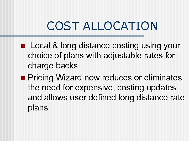COST ALLOCATION Local & long distance costing using your choice of plans with adjustable rates for charge backs n Pricing Wizard now reduces or eliminates the need for expensive, costing updates and allows user defined long distance rate plans n