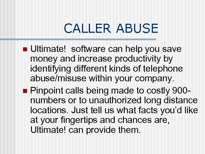 CALLER ABUSE Ultimate! software can help you save money and increase productivity by identifying different kinds of telephone abuse/misuse within your company. n Pinpoint calls being made to costly 900 numbers or to unauthorized long distance locations. Just tell us what facts you’d like at your fingertips and chances are, Ultimate! can provide them. n