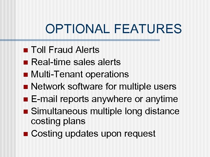 OPTIONAL FEATURES Toll Fraud Alerts n Real-time sales alerts n Multi-Tenant operations n Network software for multiple users n E-mail reports anywhere or anytime n Simultaneous multiple long distance costing plans n Costing updates upon request n