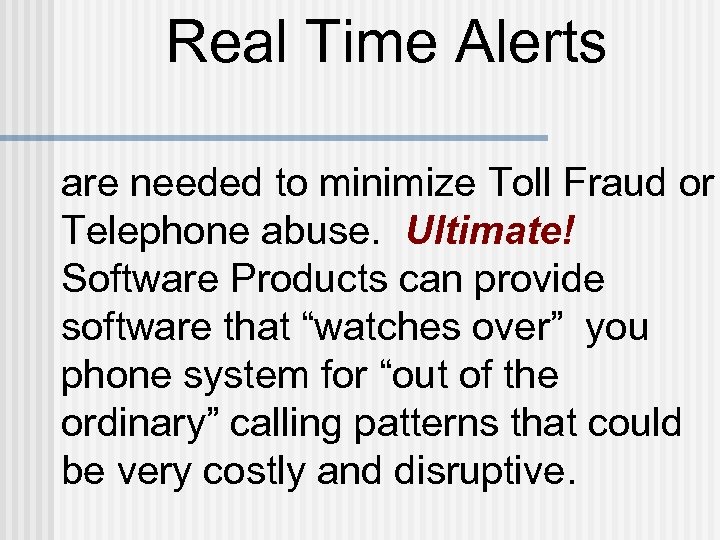 Ultimate! Toll Fraud and e-mail Alerts can be Paged, e-mail messages, or a phone call. Employee using the phone for personal business Hacker trying commit toll fraud from a city far away. Ultimate! Call Accounting & Toll Fraud