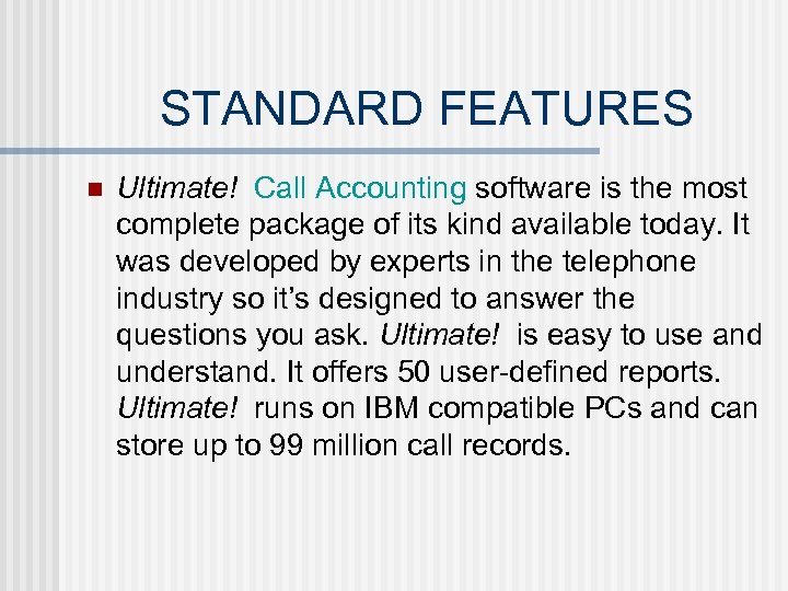 STANDARD FEATURES n Ultimate! Call Accounting software is the most complete package of its kind available today. It was developed by experts in the telephone industry so it’s designed to answer the questions you ask. Ultimate! is easy to use and understand. It offers 50 user-defined reports. Ultimate! runs on IBM compatible PCs and can store up to 99 million call records.