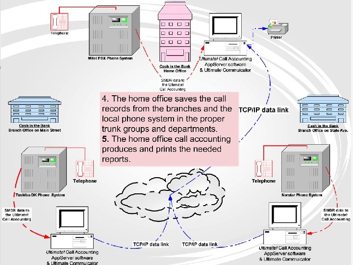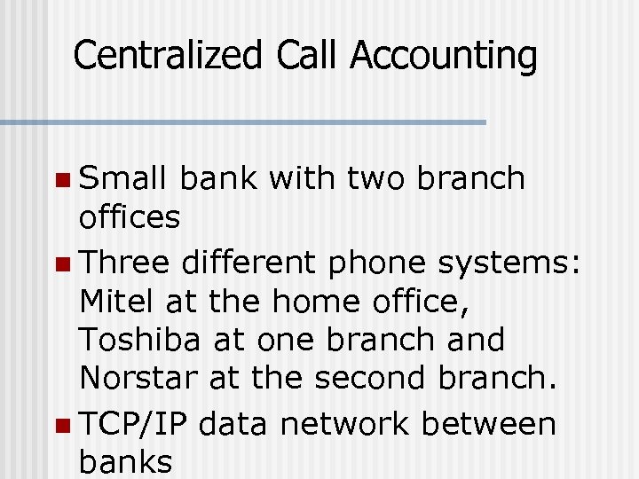 Centralized Call Accounting n Small bank with two branch offices n Three different phone systems: Mitel at the home office, Toshiba at one branch and Norstar at the second branch. n TCP/IP data network between banks