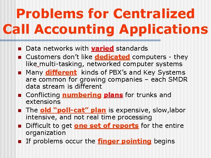 Problems for Centralized Call Accounting Applications n n n n Data networks with varied standards Customers don’t like dedicated computers - they like multi-tasking, networked computer systems Many different kinds of PBX’s and Key Systems are common for growing companies – each SMDR data stream is different Conflicting numbering plans for trunks and extensions The old “poll-cat” plan is expensive, slow, labor intensive, and not real time processing Difficult to get one set of reports for the entire organization If problems occur the finger pointing begins