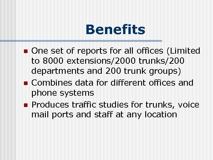 Benefits n n n One set of reports for all offices (Limited to 8000 extensions/2000 trunks/200 departments and 200 trunk groups) Combines data for different offices and phone systems Produces traffic studies for trunks, voice mail ports and staff at any location