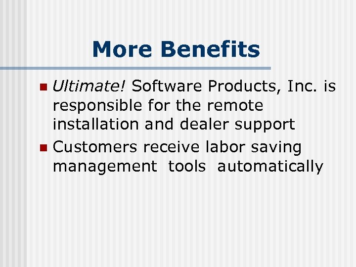 More Benefits Ultimate! Software Products, Inc. is responsible for the remote installation and dealer support n Customers receive labor saving management tools automatically n