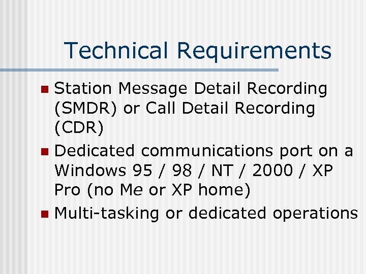 Technical Requirements Station Message Detail Recording (SMDR) or Call Detail Recording (CDR) n Dedicated communications port on a Windows 95 / 98 / NT / 2000 / XP Pro (no Me or XP home) n Multi-tasking or dedicated operations n