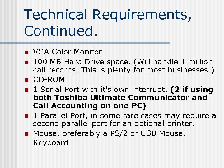 Technical Requirements, Continued. n n n VGA Color Monitor 100 MB Hard Drive space. (Will handle 1 million call records. This is plenty for most businesses. ) CD-ROM 1 Serial Port with it's own interrupt. (2 if using both Toshiba Ultimate Communicator and Call Accounting on one PC) 1 Parallel Port, in some rare cases may require a second parallel port for an optional printer. Mouse, preferably a PS/2 or USB Mouse. Keyboard