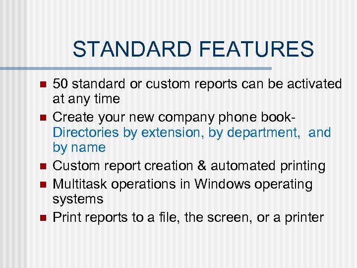 STANDARD FEATURES n n n 50 standard or custom reports can be activated at any time Create your new company phone book. Directories by extension, by department, and by name Custom report creation & automated printing Multitask operations in Windows operating systems Print reports to a file, the screen, or a printer