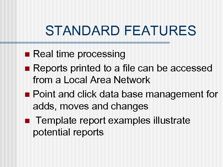 STANDARD FEATURES Real time processing n Reports printed to a file can be accessed from a Local Area Network n Point and click data base management for adds, moves and changes n Template report examples illustrate potential reports n