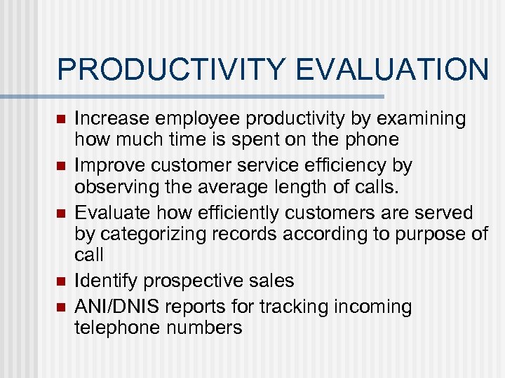 PRODUCTIVITY EVALUATION n n n Increase employee productivity by examining how much time is spent on the phone Improve customer service efficiency by observing the average length of calls. Evaluate how efficiently customers are served by categorizing records according to purpose of call Identify prospective sales ANI/DNIS reports for tracking incoming telephone numbers