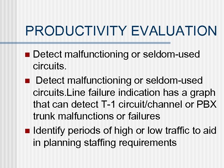 PRODUCTIVITY EVALUATION Detect malfunctioning or seldom-used circuits. n Detect malfunctioning or seldom-used circuits. Line failure indication has a graph that can detect T-1 circuit/channel or PBX trunk malfunctions or failures n Identify periods of high or low traffic to aid in planning staffing requirements n