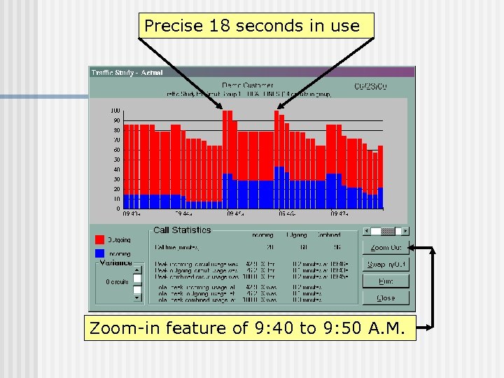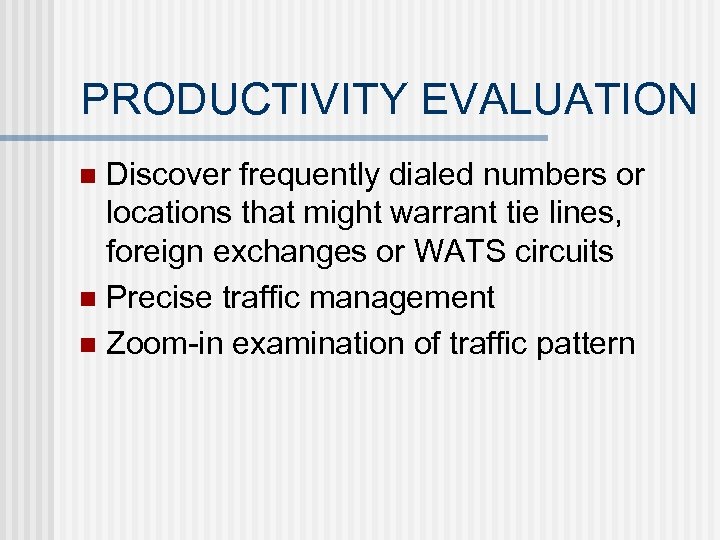 PRODUCTIVITY EVALUATION Discover frequently dialed numbers or locations that might warrant tie lines, foreign exchanges or WATS circuits n Precise traffic management n Zoom-in examination of traffic pattern n