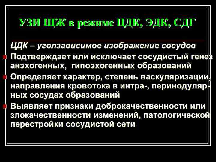 Эхо-картина подострого тиреоидита n n При ДГ значительное снижение средних скоростных показателей кровотока, значения показателей пульсационного и резистентного индекса ниже нормальных. При ЦДК, ЭДК значительное снижение или отсутствие васкуляризации патологических очагов при равномерном распределении сосудистого рисунка в нормальной окружающей паренхиме.