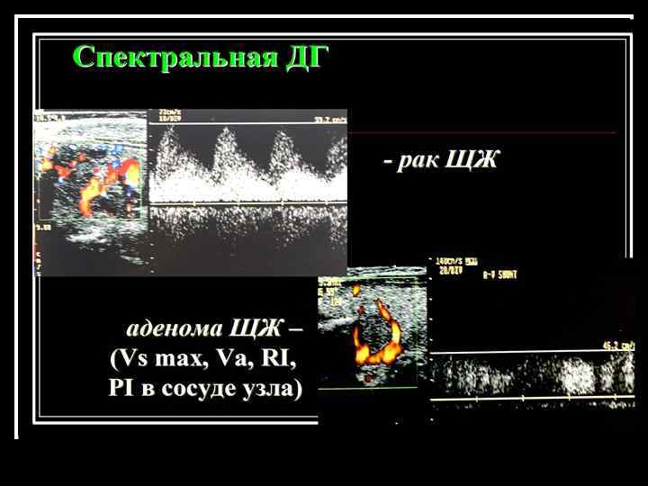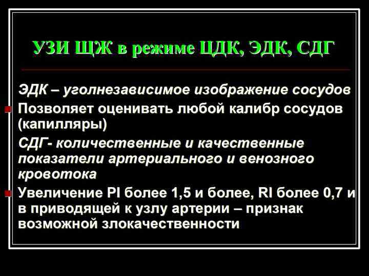 При сканировании оцениваются: n n n n Топографо-анатомические взаимоотношения со структурными элементами шеи Форма и контуры железы Акустическая плотность железы Эхоструктура различных отделов железы Локальные нарушенния эхоструктуры объемные образования Кровоснабжение железы, в том числе и внутриорганные сосуды Лимфоотток