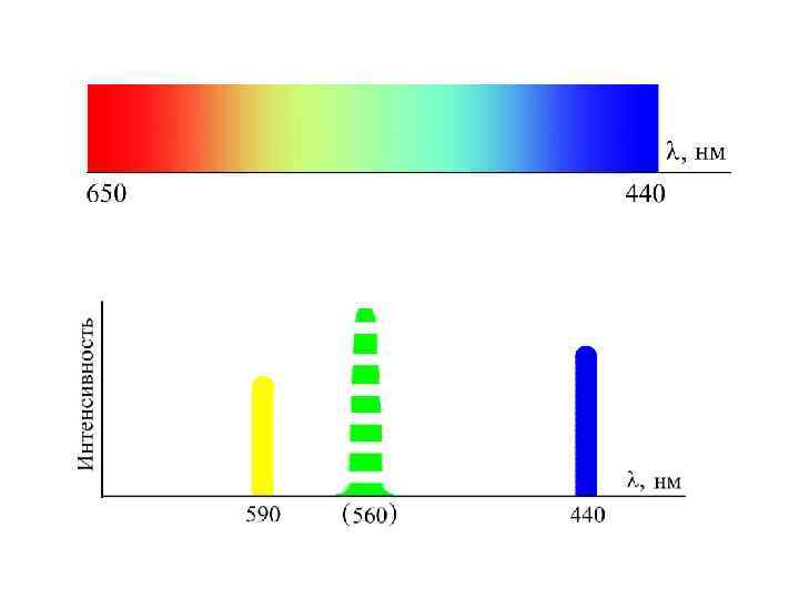 Эффект Пуркинье – различие в относительной спектральной чувствительности глаза при сумеречном зрении (пунктирная кривая) и при ярком освещении (сплошная кривая)