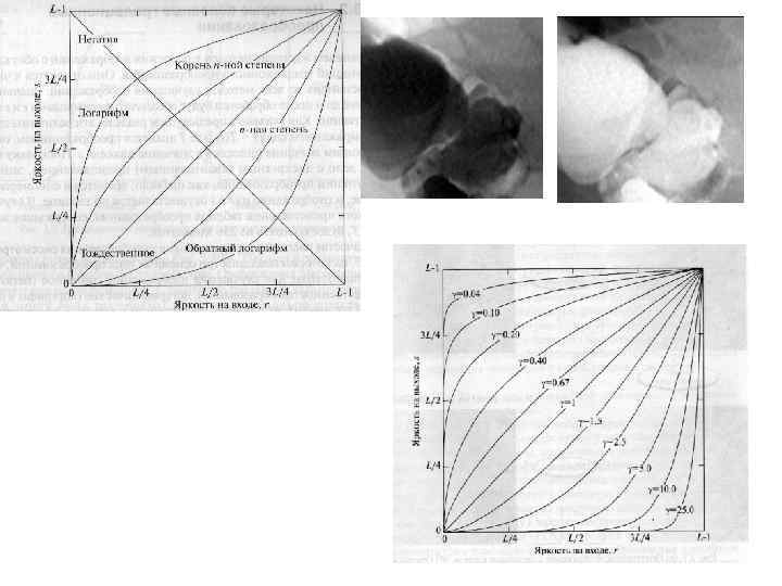 Градационные преобразования • Функция преобразования интенсивностей s=T(r) • Преобразование в негатив в диапазоне [0, L-1] s=L-1 - r • Логарифмическое преобразование s=c log (1+r) • Степенные преобразования s=crγ • Кусочно-линейные функции преобразований – Усиление контраста – Вырезание диапазона яркостей – Вырезание битовых плоскостей