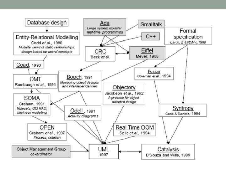 История • Так, метод Буча был хорош в проектировании, но слабоват в анализе. OMT Румбаха был, наоборот, отличным средством анализа, но плох в проектировании. И наконец, Objectory Якобсона был действительно хорош с точки зрения user experience, на который ни метод Буча, ни OMT не обращали особого внимания. Основной идеей Objectory было то, что анализ должен начинаться с прецедентов, а не с диаграммы классов, которые должны быть производными от них. • Румбах присоединился к Бучу в Rational Inc. Они объединили свои нотации и создали первую версию UML. В 1995 году на конференции OOPSLA они представили его как Unified Method, который потом и получил название UML. Чуть позже к ним присоединился Якобсон, который добавил к результатам их труда элементы Objectory и начал работу над Rational Unified Process (RUP). В 1997 году UML был отправлен в Object Management Group (OMG) для стандартизации.