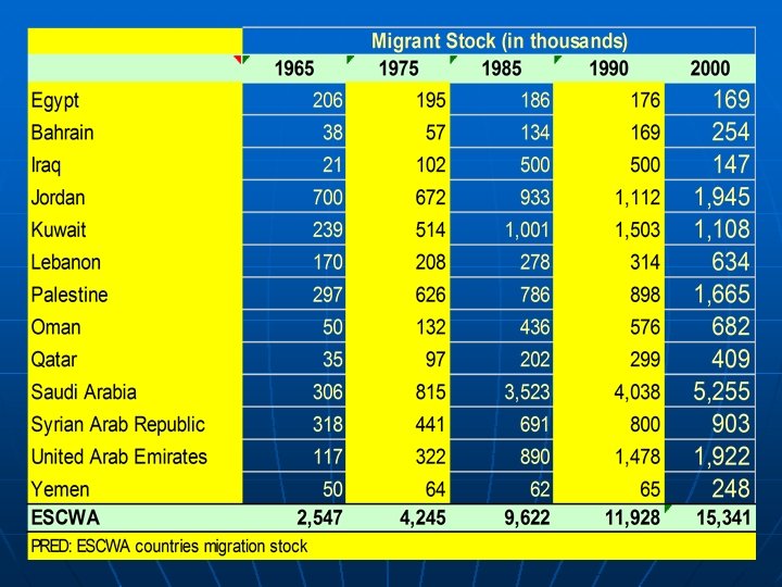 Regional Trends n n n In 1973, sharp increase in oil prices The oil-producing countries accelerated recruitment of foreign workers needed to build infrastructure. Migrants in the six member States of the Gulf Cooperation Council (GCC)- Bahrain, Kuwait, Oman, Qatar, Saudi Arabia and the United Arab Emirates • 1 million in 1970 • 4 million in 1980 • 9. 6 million in 2000, of which 5. 3 resided in Saudi Arabia.