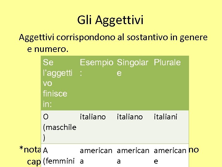 Gli Aggettivi corrispondono al sostantivo in genere e numero. Se Esempio Singolar Plurale l’aggetti : e vo finisce in: O italiano italiani (maschile ) *nota bene: aggettivi di nazionalità non sono A american (femmini a e capatalizzati a