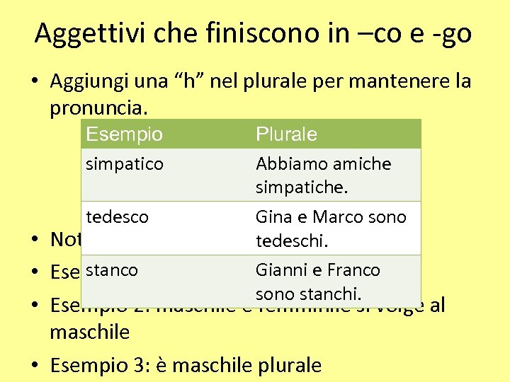 Aggettivi che finiscono in –co e -go • Aggiungi una “h” nel plurale per mantenere la pronuncia. Esempio simpatico Plurale Abbiamo amiche simpatiche. tedesco Gina e Marco sono • Nota bene: tedeschi. stanco Gianni e Franco • Esempio 1 è femminile plurale. sono stanchi. • Esempio 2: maschile e femminile si volge al maschile • Esempio 3: è maschile plurale