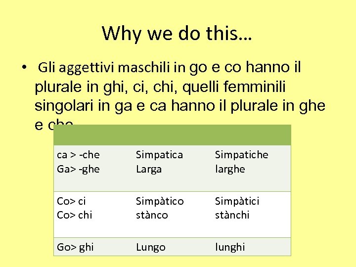 Why we do this… • Gli aggettivi maschili in go e co hanno il plurale in ghi, chi, quelli femminili singolari in ga e ca hanno il plurale in ghe e che. ca > -che Ga> -ghe Simpatica Larga Simpatiche larghe Co> ci Co> chi Simpàtico stànco Simpàtici stànchi Go> ghi Lungo lunghi
