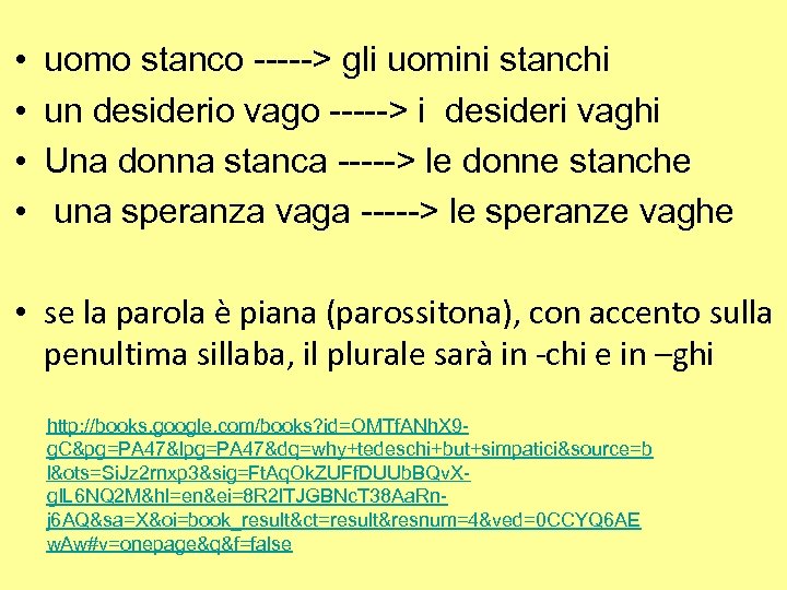• • uomo stanco -----> gli uomini stanchi un desiderio vago -----> i desideri vaghi Una donna stanca -----> le donne stanche una speranza vaga -----> le speranze vaghe • se la parola è piana (parossitona), con accento sulla penultima sillaba, il plurale sarà in -chi e in –ghi http: //books. google. com/books? id=OMTf. ANh. X 9 g. C&pg=PA 47&lpg=PA 47&dq=why+tedeschi+but+simpatici&source=b l&ots=Si. Jz 2 rnxp 3&sig=Ft. Aq. Ok. ZUFf. DUUb. BQv. Xg. IL 6 NQ 2 M&hl=en&ei=8 R 2 l. TJGBNc. T 38 Aa. Rnj 6 AQ&sa=X&oi=book_result&ct=result&resnum=4&ved=0 CCYQ 6 AE w. Aw#v=onepage&q&f=false