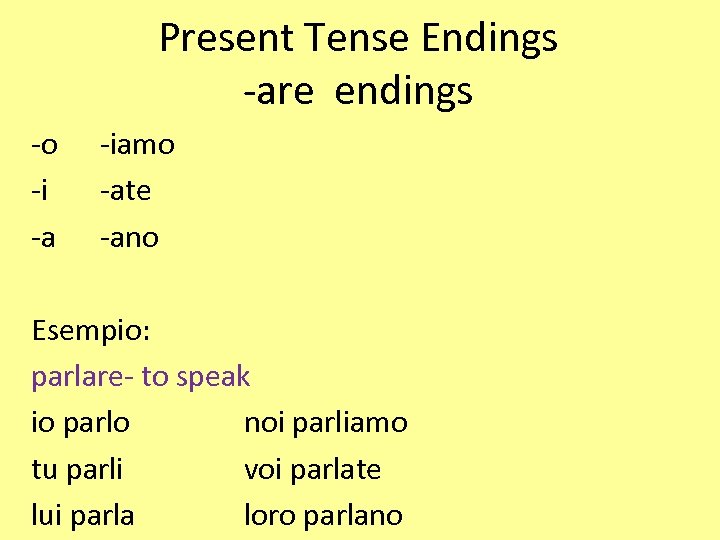 Present Tense Endings -are endings -o -i -a -iamo -ate -ano Esempio: parlare- to speak io parlo noi parliamo tu parli voi parlate lui parla loro parlano