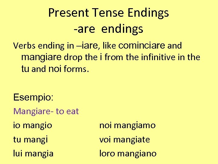 Present Tense Endings -are endings Verbs ending in –iare, like cominciare and mangiare drop the i from the infinitive in the tu and noi forms. Esempio: Mangiare- to eat io mangio tu mangi lui mangia noi mangiamo voi mangiate loro mangiano
