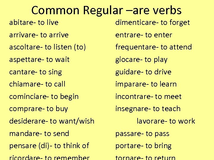 Common Regular –are verbs abitare- to live arrivare- to arrive ascoltare- to listen (to) aspettare- to wait cantare- to sing chiamare- to call cominciare- to begin comprare- to buy desiderare- to want/wish mandare- to send pensare (di)- to think of dimenticare- to forget entrare- to enter frequentare- to attend giocare- to play guidare- to drive imparare- to learn incontrare- to meet insegnare- to teach lavorare- to work passare- to pass portare- to bring