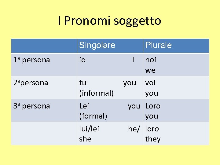I Pronomi soggetto Singolare 1 a persona 2 apersona 3 a persona io I Plurale noi we tu you voi (informal) you Lei you Loro (formal) you lui/lei he/ loro she they
