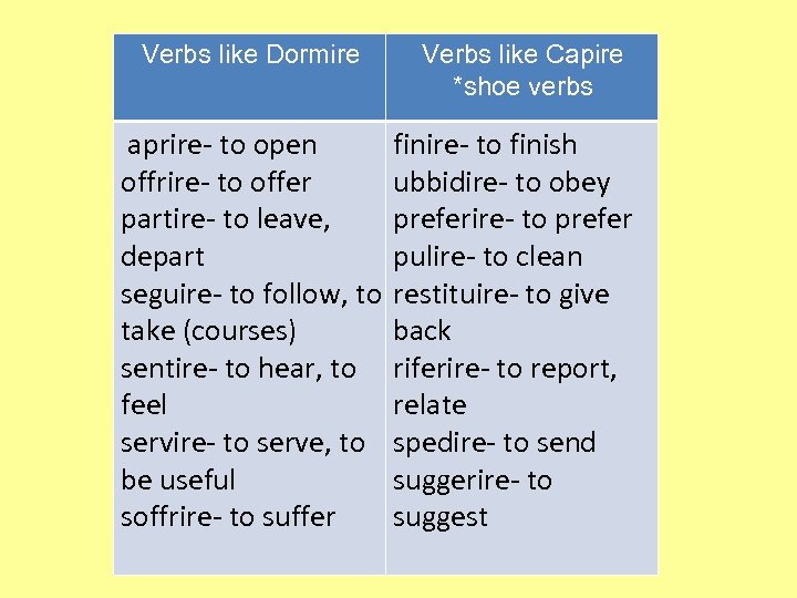 Verbs like Dormire Verbs like Capire *shoe verbs aprire- to open finire- to finish offrire- to offer ubbidire- to obey partire- to leave, preferire- to prefer depart pulire- to clean seguire- to follow, to restituire- to give take (courses) back sentire- to hear, to riferire- to report, feel relate servire- to serve, to spedire- to send be useful suggerire- to soffrire- to suffer suggest