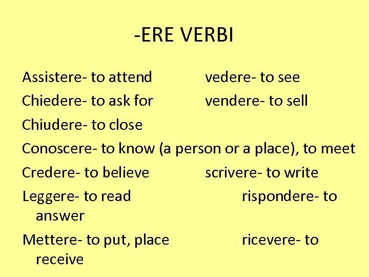 -ERE VERBI Assistere- to attend vedere- to see Chiedere- to ask for vendere- to sell Chiudere- to close Conoscere- to know (a person or a place), to meet Credere- to believe scrivere- to write Leggere- to read rispondere- to answer Mettere- to put, place ricevere- to receive