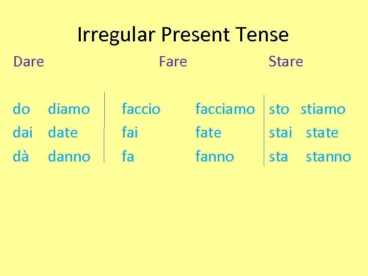 Irregular Present Tense Dare do diamo dai date dà danno Fare faccio fai fa Stare facciamo sto stiamo fate stai state fanno stanno
