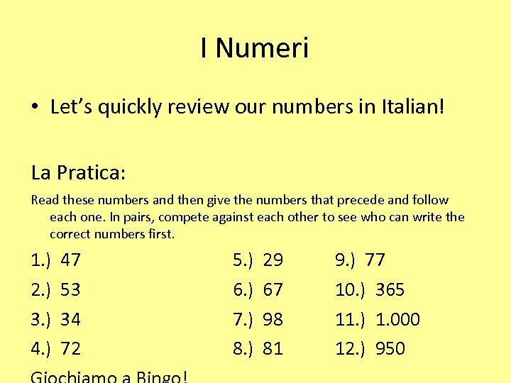 I Numeri • Let’s quickly review our numbers in Italian! La Pratica: Read these numbers and then give the numbers that precede and follow each one. In pairs, compete against each other to see who can write the correct numbers first. 1. ) 47 2. ) 53 3. ) 34 4. ) 72 5. ) 29 6. ) 67 7. ) 98 8. ) 81 9. ) 77 10. ) 365 11. ) 1. 000 12. ) 950