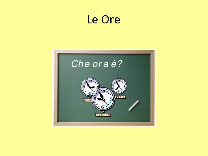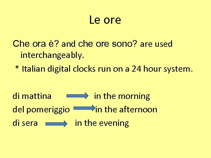 Le ore Che ora è? and che ore sono? are used interchangeably. * Italian digital clocks run on a 24 hour system. di mattina in the morning del pomeriggio in the afternoon di sera in the evening